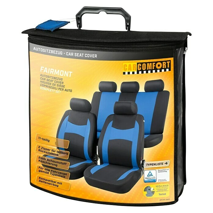 Das CarComfort Autositz-Bezugsset Fairmont überzeugt durch ein modisches hochwertiges Design. Es besitzt eine universelle Passform und ist seitenairbagtauglich. Dies ist zudem TÜV geprüft. Das Modell besteht aus zwei Einzelsitzbezügen mit integriertem Kopfstützenbezug für nicht abnehmbare und integrierte Kopfstützen und einem Rücksitzbezug. Die Sitzfläche besteht aus 2 mm dickem Schaumstoff und die Sitzbezüge sind aus Polyester gefertigt. Das Set kann bei 30°C gewaschen werden. Das Material ist flammenhemmend. Für Fahrzeuge ohne Seitenairbag gibt es keine Einschränkungen. Somit schützt und schont er vor Verschmutzung und Abnutzung. Durch die bereits integrierte Kopfstütze kann der Sitzbezug einfach über den originalen Autositz und durch integrierte Häkchen unter dem Sitz befestigt und fixiert, damit er perfekt sitzt und nicht verrutschen kann.