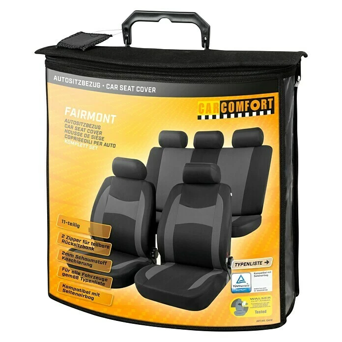 Das CarComfort Autositz-Bezugsset Fairmont überzeugt durch ein modisches hochwertiges Design. Es besitzt eine universelle Passform und ist seitenairbagtauglich. Dies ist zudem TÜV geprüft. Das Modell besteht aus zwei Einzelsitzbezügen mit integriertem Kopfstützenbezug für nicht abnehmbare und integrierte Kopfstützen und einem Rücksitzbezug. Die Sitzfläche besteht aus 2 mm dickem Schaumstoff und die Sitzbezüge sind aus Polyester gefertigt. Das Set kann bei 30°C gewaschen werden. Das Material ist flammenhemmend. Für Fahrzeuge ohne Seitenairbag gibt es keine Einschränkungen. Somit schützt und schont er vor Verschmutzung und Abnutzung. Durch die bereits integrierte Kopfstütze kann der Sitzbezug einfach über den originalen Autositz und durch integrierte Häkchen unter dem Sitz befestigt und fixiert, damit er perfekt sitzt und nicht verrutschen kann.