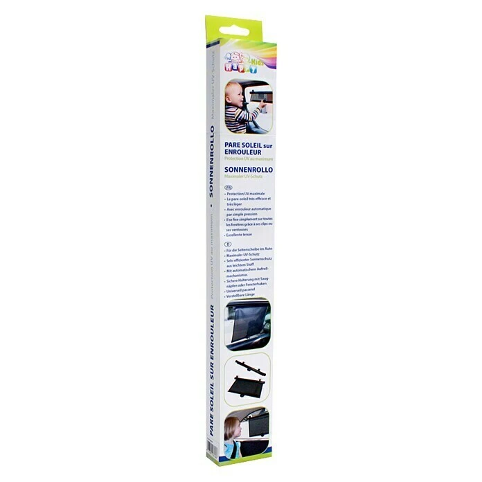 Das Happy Kids Sonnenrollo schützt Kinder bei langen Autofahrten optimal vor Sonneneinstrahlung. Es besteht aus Polyester und bietet damit besonders effektiven Schutz UV-Strahlung. Durch den automatischen Aufrollmechanismus kann die Länge immer wieder an die aktuellen Lichtverhältnisse angepasst werden. Das Sonnenrollo passt an jede Autoscheibe und kann kinderleicht mit Saugnäpfen oder Befestigungshaken angebracht werden.