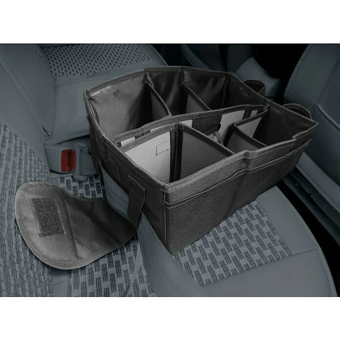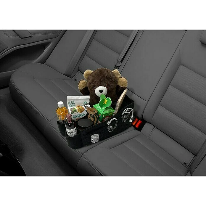 Dieser Rückbankorganizer verfügt über sechs individuell verstellbare Fächer, zwei wärmeisolierte Neopren-Getränkehalter und die äußeren Netztaschen bieten weiteren Stauraum. Für einen sicheren Halt auf der Fahrzeug-Rücksitzbank kann der Rückbankorganizer einfach mit dem Sicherheitsgurt befestigt werden. Der Organizer muss während der Fahrt immer mit dem Sicherheitsgurt befestigt sein, um ein Verrutschen oder Umherfliegen bei abruptem Abbremsen zu verhindern. Durch den praktischen Tragegriff ist der Rücksitz-Organizer überall mit dabei – auch außerhalb des Autos. Wenn nicht benötigt, lässt sich die Tasche mit wenigen Handgriffen zusammenfalten. Die Rückbanktasche besteht aus hochwertigem und strapazierfähigem Polyester für mehr Stabilität und leichte Reinigung.