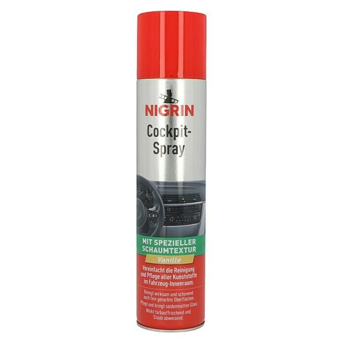 Das Nigrin Cockpit-Spray erleichtert mit seiner speziellen Schaumtextur die wirksame und schonende Reinigung und Pflege aller Kunststoffe im Fahrzeug-Innenraum. Der Schaum ermöglicht eine einfache, gezielte Anwendung und bildet einen wasserfesten, seidenmatten, schmutzabweisenden und antistatischen Schutzfilm.
