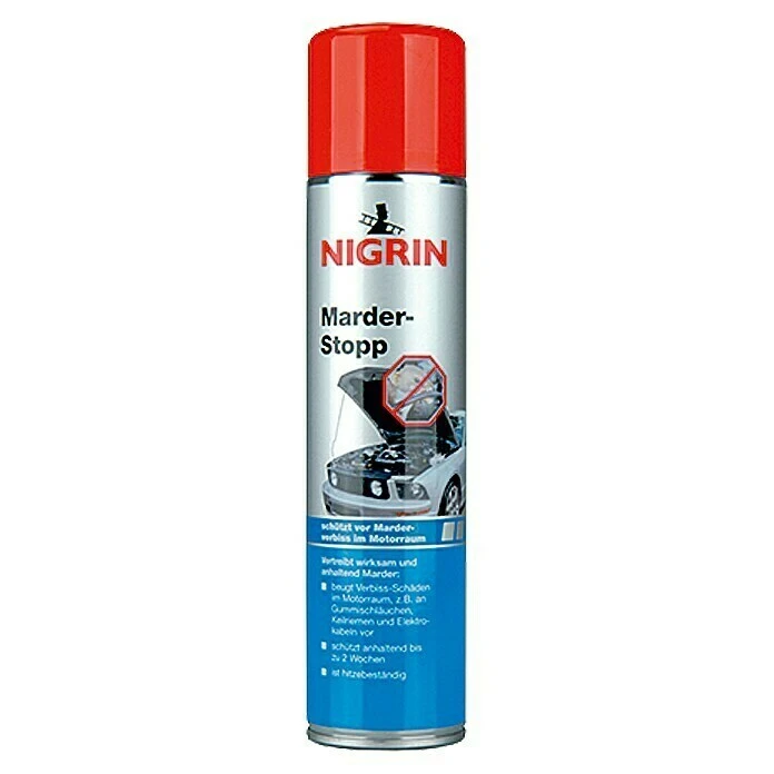Das Marder-Stopp-Spray von Nigrin ist ein wirksames, lang anhaltendes Mittel gegen Marderbisse im Motorraum. Das Spray ist von der Zusammensetzung her so konzipiert, dass sich der Marder im Motorraum nicht wohnfühlt und durch den Geruch vertrieben wird. Verwendet wird das Marderspray bei ausgeschaltetem, abgekühltem Motor. Hier ist auf eine großflächige Anwendung zu achten. Um dauerhaften Schutz zu ermöglichen sollte die Anwendung des Sprays alle zwei Wochen wiederholt werden.