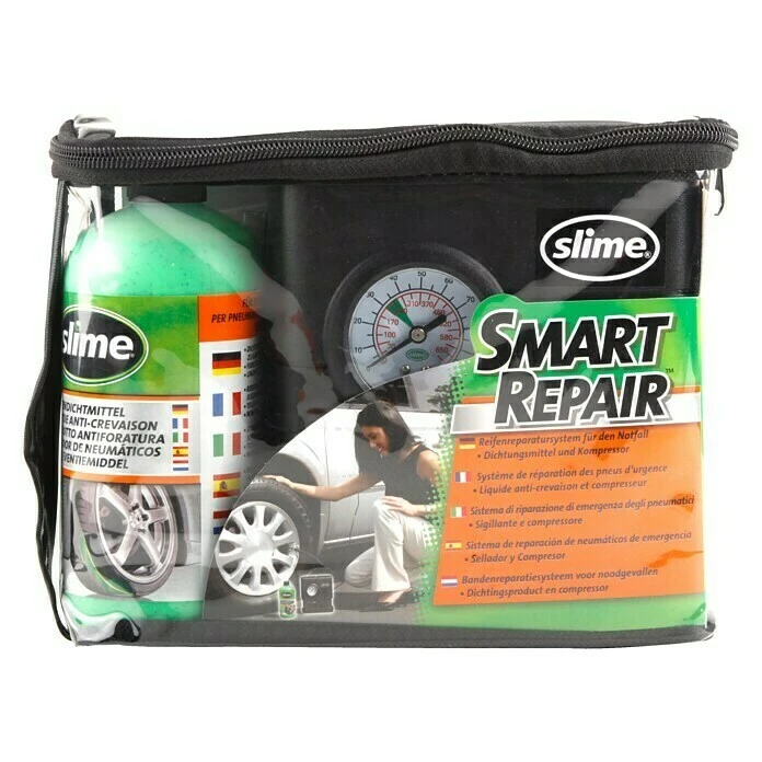 Mit dem Pannenset von Slime lassen sich Löcher von bis zu 3 mm Durchmesser bei Schlauchreifen und bis zu 6 mm Durchmesser bei schlauchlosen Reifen reparieren. Das enthaltene Dichtungsmittel ist ausreichend für einen PKW-Reifen und dichtet bei Temperaturen von -20°C bis 85°C sicher ab. Die Aufpumpzeit für Standardreifen beträgt ca. 8 Minuten. Im Lieferumfang enthalten sind ein Kompressor mit Druckmesser und Anschlusselementen, eine Flasche Reifendichtungsmittel mit Einfüllschlauch und Dosierkappe sowie Werkzeug zum Ausbau des Ventileinsatzes. Das Reifendichtmittel ist weder gefährlich, brennbar noch toxisch und kann somit ohne Bedenken mit lackierten Felgen in Berührung kommen. Da es sich um eine temporäre Reparatur handelt, empfiehlt es sich nach 3 Tagen oder 150 Kilometern den Reifen zu wechseln, da sich das Reifendichtmittel löst.