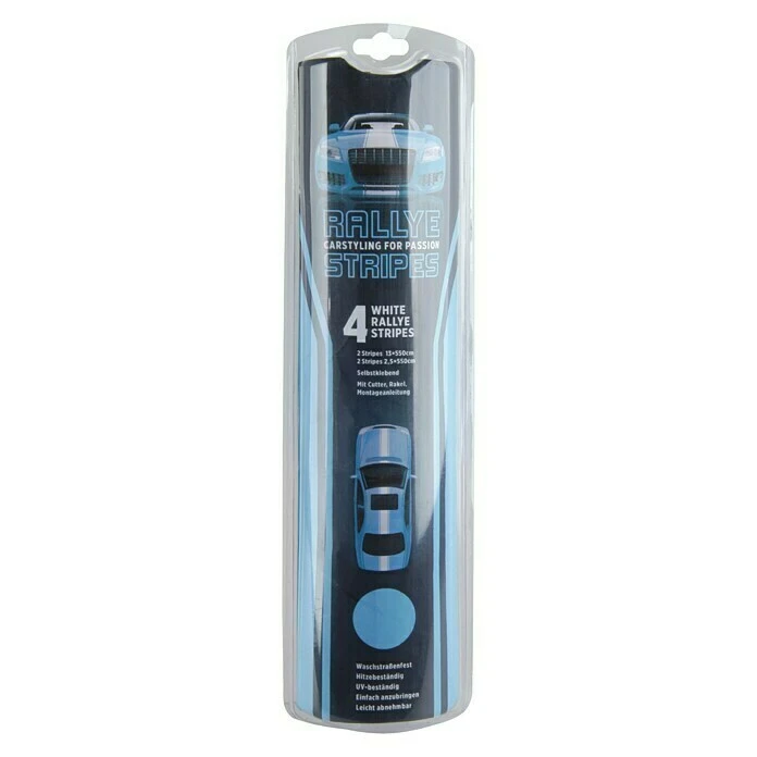 Die Auto Rallye-Streifen passen nahezu allen Pkw-Modellen, SUVs und Kleinbussen. Sie sind selbstklebend und sind daher leicht zu montieren. Das Entfernen der Streifen ist nachträglich möglich, da sie leicht abnehmbar sind. In der Verpackung gibt es 4 Streifen. 2 breite Streifen, die 13 cm lang sind und 2 schmale die 2,5 cm Länge messen. Alle 4 Streifen sind 5,5 cm breit. Eine Rakel und ein Cutter-Messer helfen bei der Montage und beim Entfernen. Zudem sind die Streifen waschstraßenfreundlich, sowie hitze- und UV-beständig.