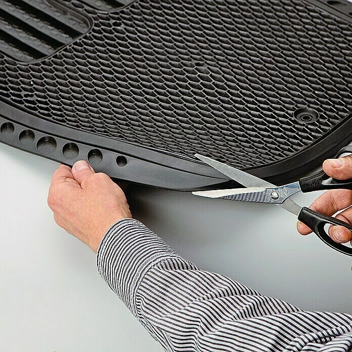 Das Kfz-Gummimattenset Gully besteht aus 2 hochwertigen Schalenmatten mit abnehmbarem Tropfgitter mit Wabenstruktur. Dies ist ideal bei Schnee und nassem Wetter, denn die Flüssigkeit wird in der Schale aufgefangen während die Schuhe auf dem trockenen Tropfgitter stehen, welches zur Reinigung einfach abgenommen werden kann. Die Matten sind universell passend, da die Seitenränder individuell zugeschnitten werden können.