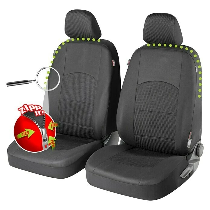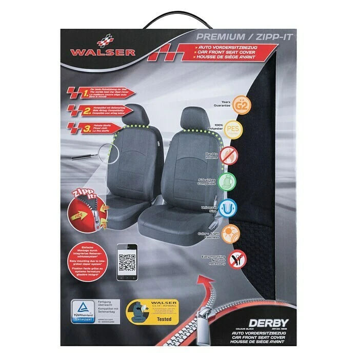 Mit dem Autositzbezug Derby von Walser wird das PKW-Interieur völlig neu gestaltet und der Wagen dadurch aufgewertet. Der Vordersitzbezug ist nach höchstem Sicherheitsstandard Clix III zertifiziert und für alle Fahrzeuge mit integriertem Seitenairbag geeignet. Somit bietet das Produkt höchste Sicherheit und kann im Ernstfall Leben retten. Die Montage der unterschiedlichen Teile des Komplettsets Derby gestaltet sich durch das Zipp-It System einfach und schnell. Nach dem Entfernen der Kopfstütze können die Vordersitzbezüge einfach über den originalen Autositz gestreift werden. Mittels eines Tunnelzugsystems werden die Bezüge unter dem Sitz befestigt. Der Rücksitzbezug wird nach Entfernung der Kopfstützen separat über die Lehne und die Sitzfläche gezogen. Durch ein integriertes Klettverschlusssystem wird der Rücksitzbezug zusätzlich befestigt und fixiert, damit nichts mehr verrutschen kann. Das hochwertige Material ist strapazierfähig und kann einfach gereinigt werden. Zu beachten sind folgende Montagehinweise: Die Kopfstützen müssen abnehmbar sein. Es darf sich außerdem um keine ausgeprägten Sportsitze wie z. B. Recaro Sitze handeln. Und schließlich dürfen die Vordersitze zwischen Rückenlehne und Sitzfläche nicht geschlossen sein.