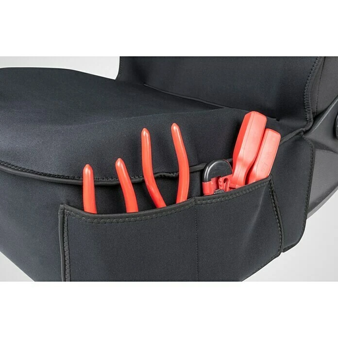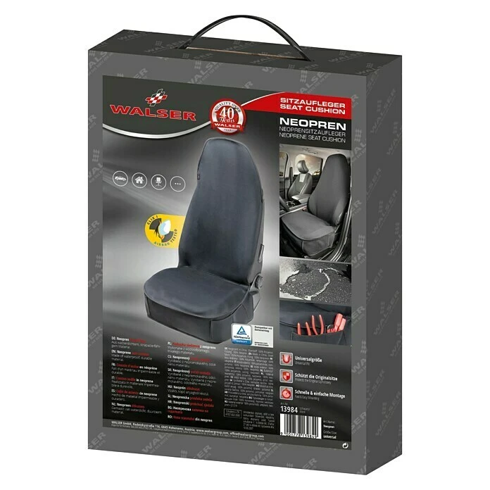 Die Autositzauflage Neopren von Walser ist der perfekte Autoinnenraumschutz für alle, die berufs- oder freizeitbedingt Schmutz und Feuchtigkeit ins Auto tragen. Handwerker und Sportler werden diesen Aufleger daher lieben! Seine Oberfläche besteht aus bi-elastischem Neopren, das eine hervorragende schmutzabweisende und wasserdichte Funktion erfüllt. So sitzt man immer im Trockenen und das Auto sieht im Innenbereich stets sauber und gepflegt aus. Unterhalb der Oberfläche besteht die Autositzauflage aus einer 5 mm dicken Schaumstoffschicht, die besten Sitzkomfort garantiert. Die Sitzfläche ist zudem mit praktischen Seitentaschen ausgestattet, in der beispielsweise Handy, Werkzeuge oder Fahrzeugpapiere griffbereit verstaut werden können. Die Autositzauflage ist einfach zu montieren und deckt – wie ein Neoprenanzug – den gesamten Autositz ab. Damit ist nicht nur vollumfänglicher Schutz garantiert, sondern auch eine sportlich-elegante Optik, die das Auto von innen heraus aufwertet. Die Auflagen eignen sich für alle gängigen Fahrzeuge mit und ohne Seitenairbag.