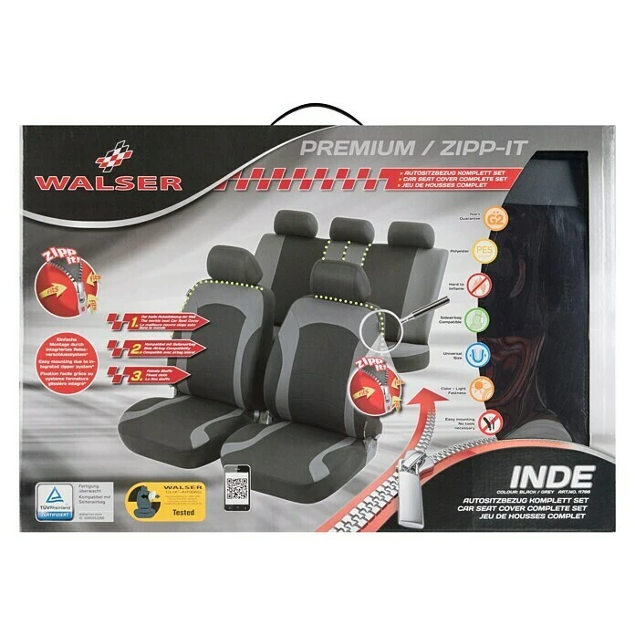 Die Autositzbezüge Inde zeichnen sich durch klassisch schlichtes Design aus und eignen sich hervorragend um jedem Auto einen komplett neuen Look zu verleihen. Die Sitzbezüge haben neben modernem Design und hoher Qualität noch mehr zu bieten. Die Montage der Sitzbezüge ist sehr einfach gestaltet und schnell erledigt. Nach der Entfernung der Kopfstützen können die Bezüge einfach über die Sitze gestreift und unter dem Sitz mit Häkchen fixiert werden. Durch das integrierte Zipp-It Reißverschlusssystem können die Kopfstützen ohne Einschneiden schön eingepasst werden. Das hochwertige Material ist strapazierfähig und kann einfach gereinigt werden. Bei der Montage gilt es zu beachten, dass es sich bei den Sitzen nicht um ausgeprägte Sportsitze wie z.B. Recaro Sitze handeln darf. Zudem dürfen die Vordersitze zwischen Rückenlehne und Sitzfläche nicht geschlossen sein.