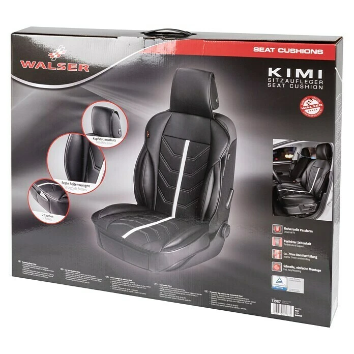 Die Autositzauflage Kimi von Walser verwandelt einen gewöhnlichen PKW von innen heraus in einen erstklassigen Rennwagen. Das perforierte Kunstleder mit den schön gearbeiteten Ziernähten verlieht den Autositzen eine sportliche und zugleich edle Optik, die das Rennfahrerherz gleich höher schlagen lässt. Ein besonderes Detail stellen die zwei Taschen an der Vorderseite dar, die auf raffinierte Weise zusätzlichen Stauraum für das Smartphone und wichtige Dokumente bereitstellen. Der Sitzaufleger Kimi besitzt alle Eigenschaften eines Sportsitzes. Durch feste Seitenwangen und eine 7 mm starke Polsterung ist komfortables Sitzen auch während langen Fahrten gewährleistet. Die Montage des Sitzauflegers ist sehr einfach und schnell erledigt: Das Produkt zieht sich bis über die Kopfstütze und wird hinten mittels Schnappverschluss befestigt. Zusätzlich ist das Material leicht mit einem feuchten Tuch zu reinigen. Mit dem sportlichen Sitzaufleger Kimi wird jede Fahrt zum Erlebnis.