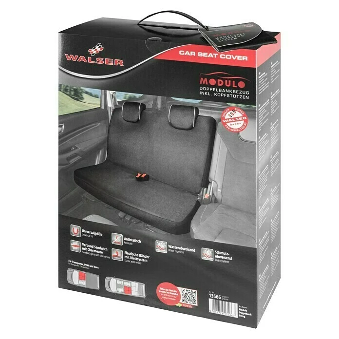 Der Doppelbankbezug aus der Serie Modulo ist anwendbar in allen gängigen Transportern und Pkws. Der Bezug überzeugt nicht nur durch ansprechendes Design sondern auch durch einfache Handhabung. Der Bezug ist aus Polyester Jersey gefertigt und sehr hochwertig verarbeitet. Darüber hinaus besitzt das Material antistatische, wasser- und schmutzabweisende Eigenschaften, die das Produkt insgesamt sehr strapazierfähig und langlebig machen. Der Doppelbankbezug lässt sich sowohl auf dem Vordersitz als auch auf dem Rücksitz verwenden. Der Doppelbankbezug wird inklusive 2 Kopfstützenbezügen geliefert und wird wie folgt montiert: Die Kopfstützenbezüge können ganz einfach übergezogen werden und passen sich aufgrund des integrierten Gummizuges schön an. Der Doppelbankbezug wird über die gesamte Sitzbank gezogen und dann mit Gurten an der Kopfstütze und unter dem Sitz fixiert. So kann der Doppelbankbezug nicht mehr verrutschen und schützt ihre Autositze optimal vor Verschmutzung und Abnutzung.