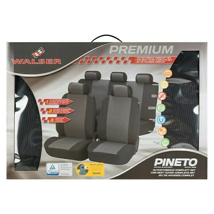 Der stilvolle Autositzbezug Pineto von Walser wertet den Innenraum nahezu jeden Fahrzeugs formvollendet auf. Er ist modern und anschmiegsam und kann dabei sogar Leben retten: Die computerkontrollierte Naht sorgt dafür, dass sich der Seitenairbag im Ernstfall zuverlässig entfalten kann. Aber nicht nur die Sicherheit spricht für den Autositzbezug Pineto, sondern auch seine exzellente Verarbeitung, das moderne Design und die einfache Befestigungsmöglichkeit. Zwei Vordersitzbezüge sowie zwei Nackenstützbezüge in der Farbe Grau umschließen den Autositz wie eine zweite, neue Haut. Ältere Sitze erstrahlen wie neu und Sitze in einem Neuwagen werden durch die Sitzbezüge zuverlässig vor Abnutzungserscheinungen geschützt. Bei der 8-tlg. Variante sind Bezüge für den Rücksitz mit dabei. Lichtecht und farbbeständig sorgt der Autositzbezug Pineto viele Jahre lang für einen neuen Look in Ihrem Fahrzeug. Das Material aus 100 % Polyester ist flammhemmend und bequem bei 30°C waschbar. Die Sitzflächen werden durch eine 3 mm dicke Schaumstoff-Kaschierung aufgepolstert. Zu beachten sind folgende Montagehinweise: Die Kopfstützen müssen abnehmbar sein. Bei den Sitzen darf es sich um keine ausgeprägten Sportsitze wie z.B. Recaro Sitze handeln. Die Vordersitze dürfen außerdem nicht zwischen Rückenlehne und Sitzfläche geschlossen sein.