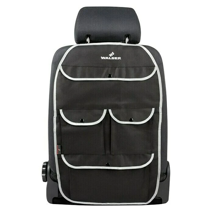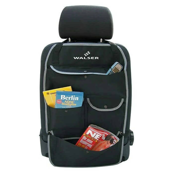 Der Organizer Lucky Tom wurde speziell für die Verwendung in Dienstwagen entwickelt, doch findet er auch seinen Platz im Privat- und Familienauto. Lucky Tom hat eine klassisch schwarze Grundfarbe mit grauen Einfassbändern als optisches Highlight. Die Tasche fügt sich nahtlos in den Innenraum Ihres Fahrzeuges ein und bietet viele Möglichkeiten, um Gegenstände zu versorgen. 3 Taschen sind mit Druckknöpfen sogar verschließbar und ein großes offenes Fach unten für z.B. Zeitschriften oder Kinderbücher, erlauben einen schnellen Zugriff auf das benötigte Produkt. Die Rücksitztasche Lucky Tom ist sehr schnell im Auto installiert und einsatzbereit. An der oberen Kante befindet sich ein längenverstellbarer Gurt mit Schnappverschluss den Sie um die Kopfstütze befestigen. Schon ist die Montage erledigt und Sie können die Tasche mit den wichtigsten Sachen befüllen.
